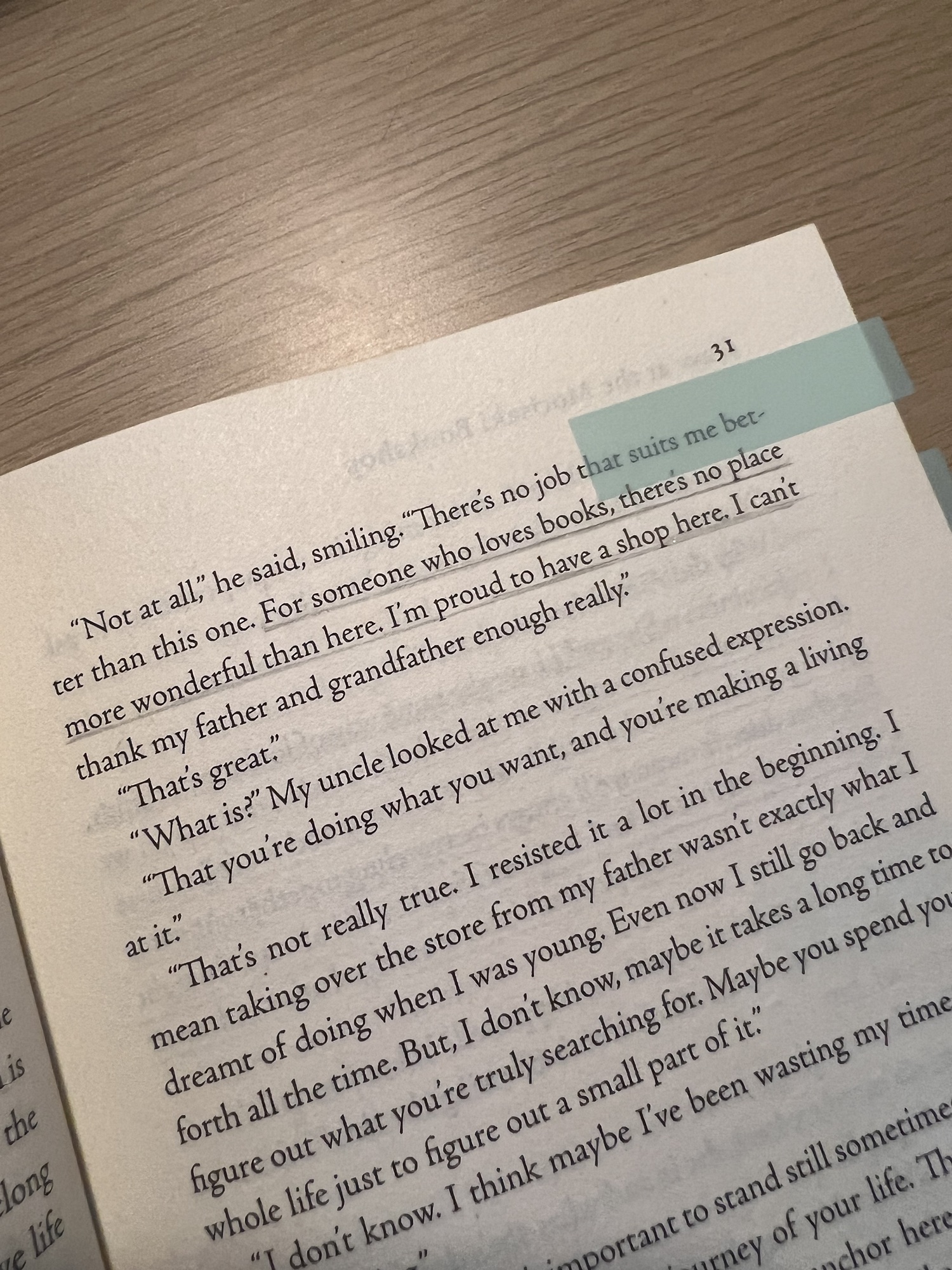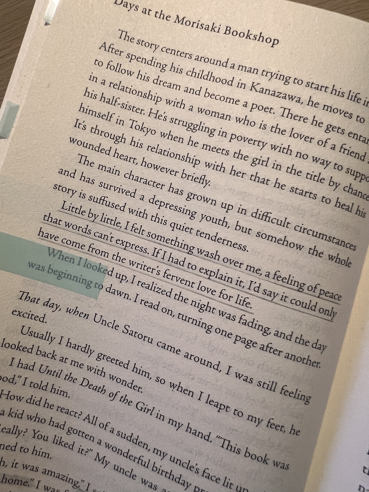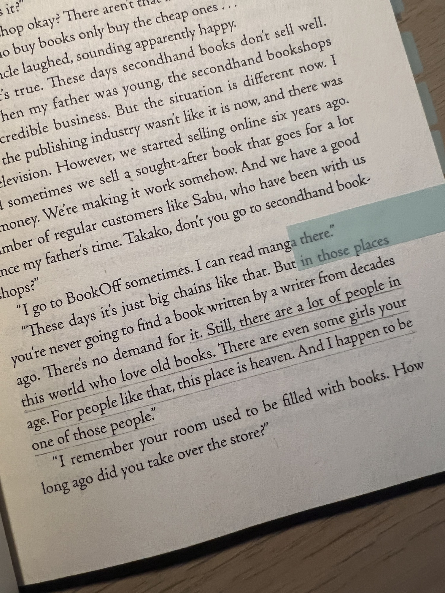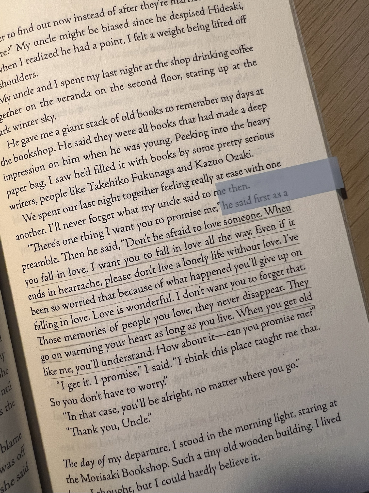 In the book’s first part, I felt a deep connection and found myself underlining entire pages. By the end of that part, I felt emotional but also filled with a sense of joy. This book has become one of my all-time favorite comfort reads, offering me so much in just 145 pages. For some book lovers like me who find joy in stories involving books or an author’s life, this book encompassed all that and more. It delicately addressed sensitive topics like heartbreaks, loss, loneliness, and reconciliation without coming across as didactic. The characters were appealing, and the depiction of the Jimbocho area, known for its numerous second-hand bookstores, was a reader’s paradise. I loved how Takako formed this bond with Uncle Sator when she got to know him and how she changed. Takako’s uncle’s support and her healing journey through immersing herself in books, she discovered a newfound strength she never knew she possessed. Each page she turned, each story she read, became a stepping stone toward reclaiming her sense of self.